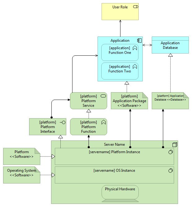 From the bottom left, the Platform and OS “Artifact” elements represent the more conceptual software and versions, the “System Software” then is the installed instance of that software. The “System Software” then either support “Interfaces”, “Functions” and “Services” themselves (as in the case of a low level OS function) or the “System Software” has other deployed “Artifacts” in the form of other ‘Application Package <<Software>>’ or ‘Application Database <<Database>>’ components. These “Artifacts” then realize the “Application Component” and “Application Data” respectively.
